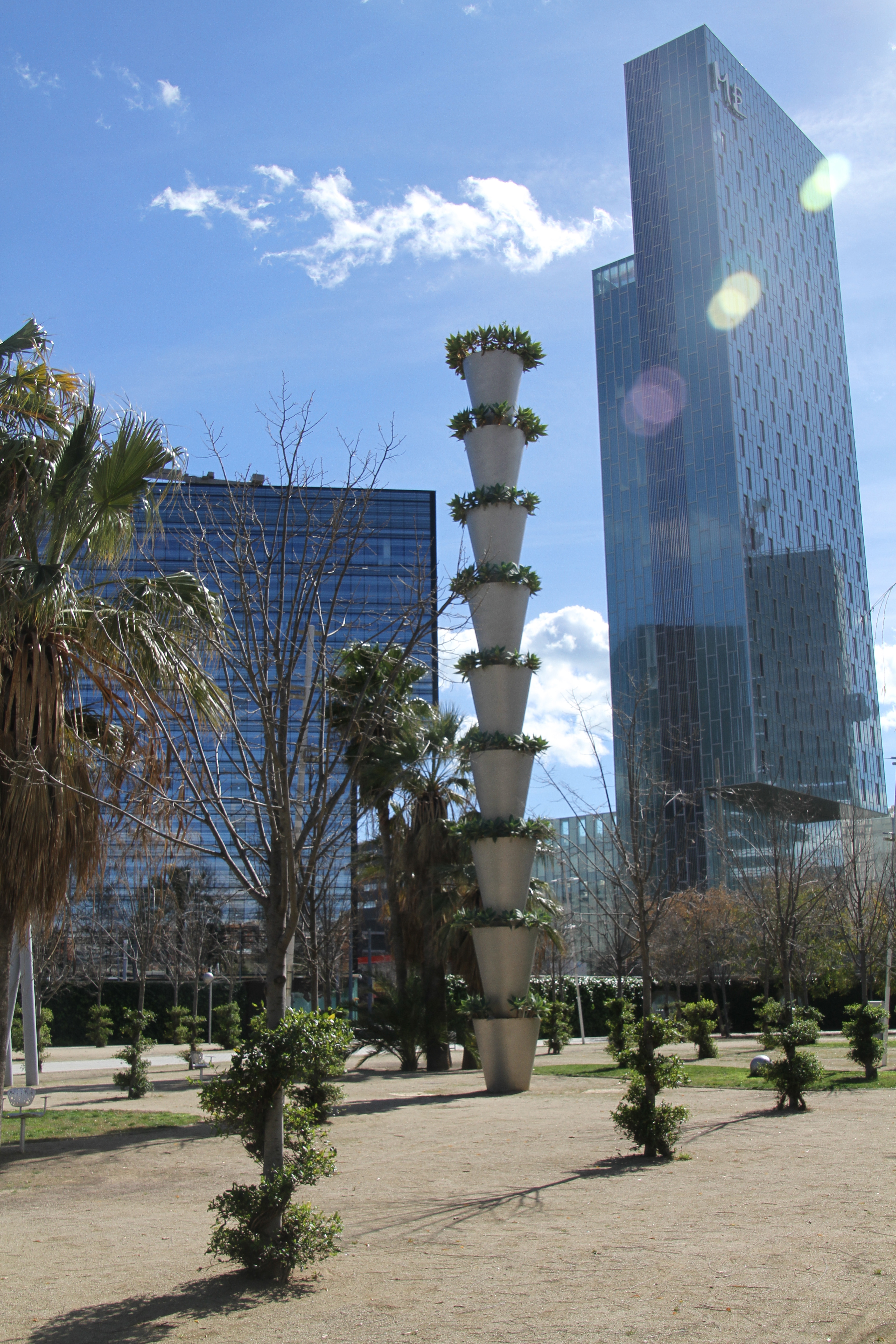 Before crossing Av. Diagonal, there is the the Parc del Centre del Poblenou. I’ve driven by it numerous times on my way to visit my friends, but I had never had the chance to enter until now. There are three different sections separated by roads. I first entered the eastern-most park. This one is the smallest of the three, and feels much more enclosed and separated from the rest of the world. The middle is full of trees that have small, hard, black and red berries. It was only after an older man with a dog came up to me to tell me about the trees that I found out they are actually a form of pepper. I appreciated the information, although it is always uncomfortable when a stranger approaches you in such a solitary place as this.