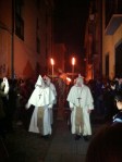 After the first procession I saw, Isabel and I headed for a quick dinner with her friends. We went to a bar where we ate a bunch of tapas, and only paid five euro each person. The next procession was due to begin at 12:00 midnight, and only one of Isa’s friends was strong enough to brave it with us. This procession was to end at the Plaza de Santa Lucía, where the brothers would then sing. This is one of Isa’s favorite processions, and so far it has been my favorite as well.
